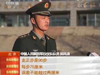 中国人民解放军仪仗队队员郭凤通:我们这次任务,走正步是96步,每步是75厘米,误差不能超过两厘米。为了高标准完成这次任务,我和我的战友每个动作都要做到精准无误。我们想了很多办法,比如说我们操场上有步幅线,有的时候进行个人体会、分组练习,和方队合成。